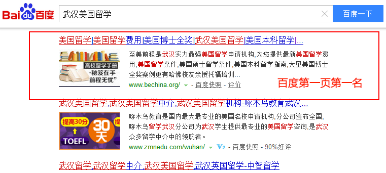 關鍵詞“武漢美國留學”在百度排名:第1頁第1名