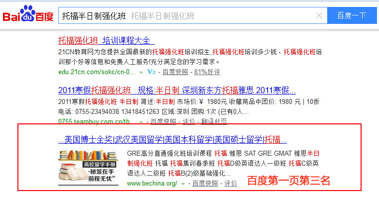 關鍵詞“托福半日制強化班”在百度排名:第1頁第3名