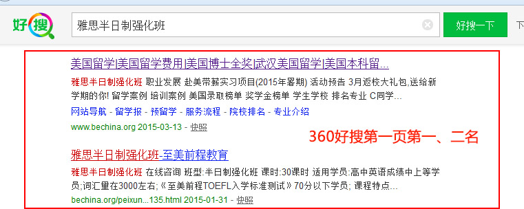 關鍵詞“雅思半日制強化班”在好搜排名:第1頁第2、3名